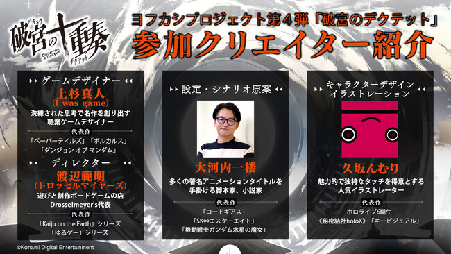 ヨフカシプロジェクトは、IP創生を目的としたメディアミックスプロジェクトです。株式会社コナミデジタルエンタテインメント、アニメイトグループの事業会社である株式会社オーシャンフロンティア、株式会社ドロッセルマイヤー商會の3社が共同で立ち上げ、ボードゲームを起点にさまざまなIPを育てていくプロジェクトです。プロジェクトプロデュースは株式会社コナミデジタルエンタテインメント、企画・販売は株式会社オーシャンフロンティア、ゲームデザインは株式会社ドロッセルマイヤー商會が担当します。