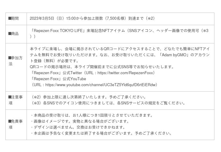 さらに、ライブ会場に当日設置される「Repezen Foxx」メンバーの等身大パネルと一緒に撮影した写真をお送りいただいた方限定で、その写真とライブ会場で受け取ることができるものとは別デザインの記念NFTを組み合わせたオリジナルNFTを受け取ることができる企画なども予定しています。詳細は「Repezen Foxx」の公式SNS等からの情報発信をお待ちください。