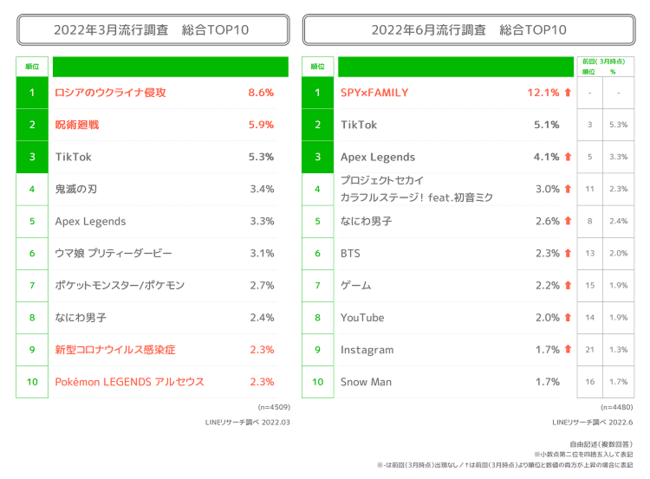 ・2022年上半期は、3月期と6月期で上位10位が大きく入れ替わる結果となった。中でも、2022年6月期の最新調査では「SPY×FAMILY」が急上昇で1位にランクイン。SNS関連では、「TikTok」が前回調査に続き上位3位以内にランクインし、「YouTube」「Instagram」も上位10位以内にランクインした。