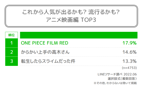 ・2位は「からかい上手の高木さん」、3位は「転生したらスライムだった件」がランクインした。『アニメ映画編』のランキングは男女ともに上位3位が同じ作品という結果となった。