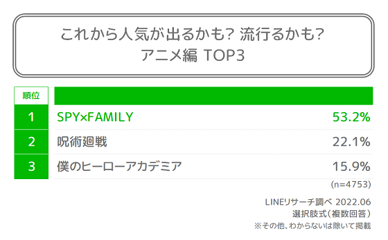 ・『アニメ編』では「SPY×FAMILY」が1位となった。特に女性は6割弱で男性に比べて割合が高くなった。
