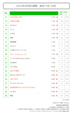 ・6月期の総合11位以降のランキングでは「なかやまきんに君」が11位にランクインし、前回51位から大幅に上昇する結果となった。12位には「五等分の花嫁」、20位には「スターバックスコーヒー※」、24位には「日本プロ野球」がランクインした。