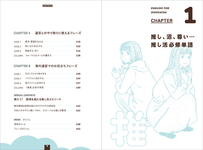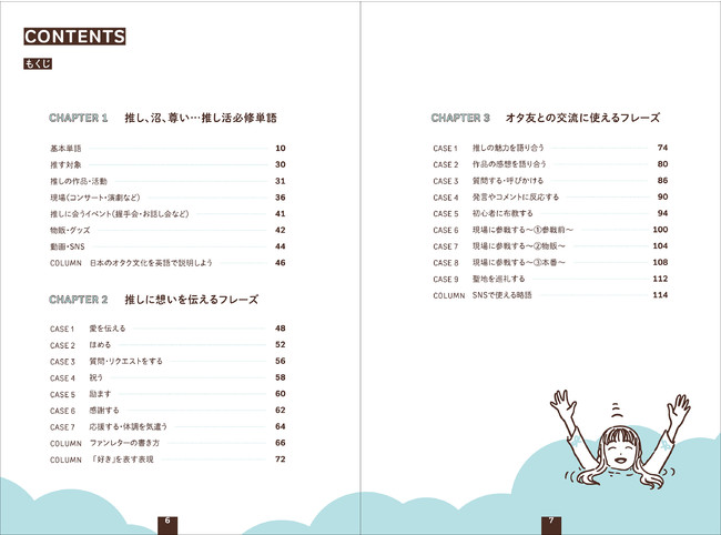 推しが英語圏にいる方はもちろん、日本の漫画・アニメやアイドルの魅力を海外ファンと語り合いたい方、渡米・渡欧する推しを英語で応援したい方、海外のプレイヤーと英語でチャットをしながらオンラインゲームをする方… いろいろな方にご活用いただけるよう、ジャンルを問わず使える330語と477フレーズを厳選しました。それらを直訳するのではなく、英語圏のオタクの方々にご協力いただき、現地でも通じる「生きたオタク語彙」を掲載しています。