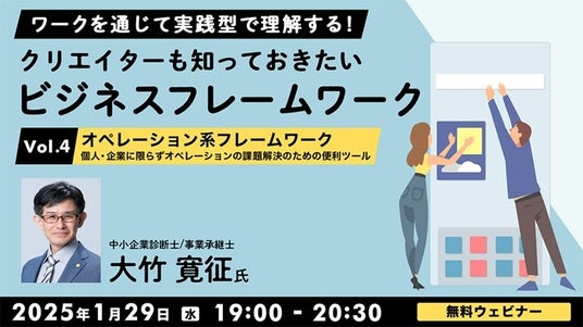 株式会社クリーク・アンド・リバー社(C&R社)は1月29日(水)、経営や経済について学んだことのないクリエイターの方を対象に無料のオンラインセミナー「ワークを通じて実践型で理解する! クリエイターも知っておきたいビジネスフレームワークVol.4 オペレーション系フレームワーク【個人・企業に限らずオペレーションの課題解決のための便利ツール】」を開催します。