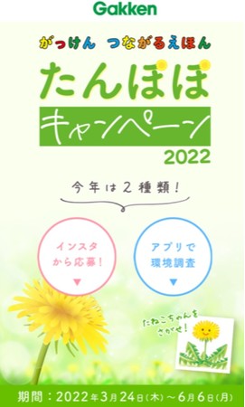 株式会社 学研ホールディングス(東京・品川/代表取締役 社長:宮原博昭)のグループ会社、株式会社 学研教育みらい(東京・品川/代表取締役社長 兼 COO:小林徹)は、3月24日~6月6日に、インスタグラムを通じてたんぽぽの写真を募集する「たんぽぽはっけんキャンペーン」を展開します。