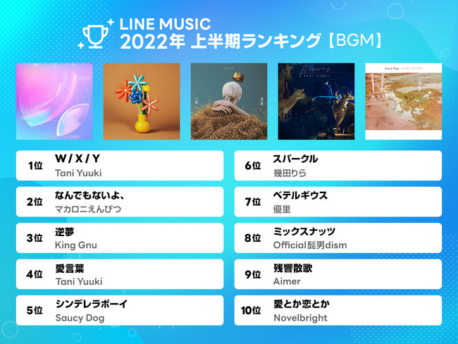 4位には10代トレンドランキング、BGMランキングでも1位、カラオケランキングでもTOP10入りを果たしたTani Yuuki「W / X / Y」、昨年「ドライフラワー」で上半期1位、年間ランキングでも3位を獲得した優里の「ベテルギウス」、「レオ」が続いてランクインする形となりました。