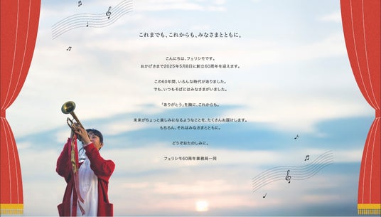 フェリシモは、2025年5月8日に創立60周年を迎えます。その節目に、未来を共創するプロジェクト『STAGE60』を5月8日から本格始動します。『STAGE60』は、「未来をつくる60の物語」をテーマに、60の多彩な企画を展開予定です。また、「ともにしあわせになるしあわせ」というコアバリューをもとに、1000万人以上の参加を目指すプロジェクトとなっています。