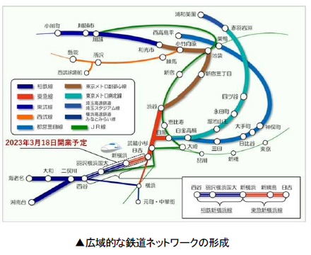 2023年3月18日(土)相鉄新横浜線・東急新横浜線の開業に伴い、神奈川県央地域及び横浜市西部から東京23区西部、東京多摩北部、埼玉中央地域・西部地域に至る広域的な鉄道ネットワークが形成されることで、地域間の連携と活性化が図られ、各地域のさらなる発展に寄与します。