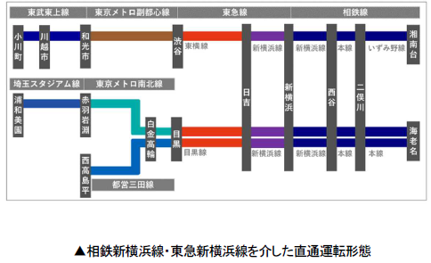 なお、相鉄新横浜線・東急新横浜線を介した直通運転形態について、相鉄本線からの列車は東急目黒線方面に乗り入れ、 東京メトロ南北線、都営三田線、埼玉スタジアム線に直通します※3。また、相鉄いずみ野線からの列車は東急東横線方面に乗り入れ、東京メトロ副都心線、東武東上線に直通します※3。