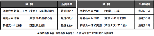 相鉄新横浜線・東急新横浜線は、相鉄本線・相鉄いずみ野線、東急東横線・目黒線に接続し、東京メトロ南北線・副都心線、 都営三田線、埼玉高速鉄道埼玉スタジアム線、東武東上線まで直通運転を行い、7社局14路線を結ぶ広大な鉄道ネットワークを形成することで、所要時間の短縮、乗換回数の減少など交通利便性・速達性が向上します※2。