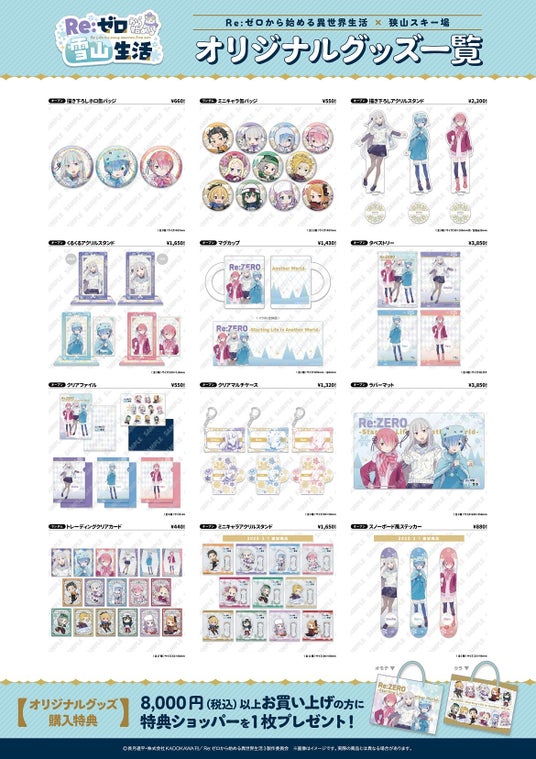 本コラボでは、TVアニメ「Re:ゼロから始める異世界生活」よりエミリア、レム、ラムの冬デートコーデの描き下ろしイラストとともにスキーやソリを楽しんでいるミニキャライラストが登場いたします。施設内では、本コラボのイラストを使用したオリジナルグッズの販売やフードメニュー、縁日コーナー、雪山チャレンジなど本コラボ限定の内容で皆さまをお迎えいたします。さらに、チケット風イラストカードやカードスリーブなどが付いたオリジナルバンドル付きスペシャルチケットも販売いたします。