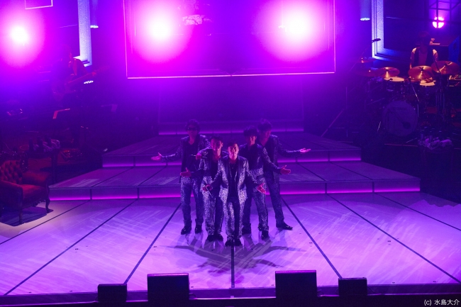 ライブの幕開けを飾ったのは「GOSWING」。ファンキーなグルーヴに乗せて、5人がそろいの振り付けで歌い踊ると、会場は一気に華やかな雰囲気に。個性豊かな5人の歌声が織り成すボーカルワークを武器に、ステージを盛り上げていく。彼らの王道ともいえるラブソングもたっぷりと披露。ロマンチックな「Dream Girl」をはじめ、最新アルバムに収録された濃密なナンバーを艶のあるボーカル、美しいハーモニーで聴かせる。