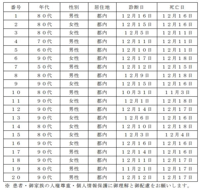 都内で新型コロナウイルスに感染した方が死亡されましたのでお知らせします。