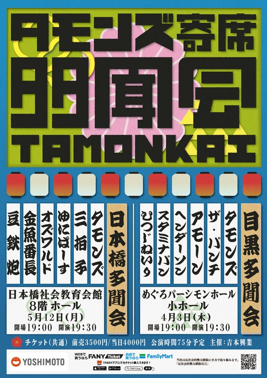タモンズによる寄席イベント、タモンズ寄席 「目黒多聞会」・「日本橋多聞会」を4月3日(木)に東京・めぐろパーシモンホール・小ホール、5月12日(月)に東京・日本橋社会教育会館・ホールにて開催することが決定いたしました。