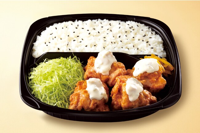 ※売り場に並んでいる、すぐにお持ち帰りできる「若鶏のこだわり醤油唐揚げ弁当」「おろし唐揚げ弁当」は、キャベツの千切りの代わりにきんぴらごぼうとたけのこの煮物(若鶏のこだわり醤油唐揚げ弁当)、またはパスタ(おろし唐揚げ弁当)を使用しています。