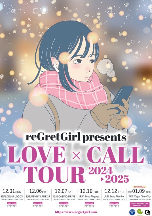 既に発表されていた全国5カ所に加えて、今回新たにZepp DiverCity TOKYOでの公演が発表され、全国6か所を巡るツアーとなる予定。東京でのツアーファイナルはreGretGirl結成10周年を記念したワンマン公演となっている。東京以外の5公演の出演アーティストは後日発表されるので楽しみに待とう。