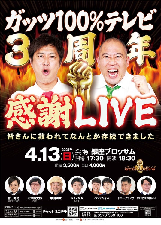 BSよしもとで開局から放送中の企業案件全力取り組みバラエティ番組「ガッツ100%テレビ~笑いと愛が企業を救う~」が番組3周年を記念し、今回念願のイベント開催が決定いたしました。ここまで山あり谷ありでいろんな試練がありましたが、ガッチャー(番組ファン)