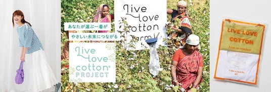 ファッションにとって最も身近な素材である「コットン」。栽培には大量の農薬が使われ、農家の健康被害や借金苦、土地がやせる原因になっています。「リブ ラブ コットン (LLC)」プロジェクトでは、インド産オーガニックコットンの商品1枚につき100円の「Live love cotton基金」を付けて販売。基金は現地のニーズに応じて「オーガニックコットンの農業支援」「子どもたちの教育サポート」「女性の収入向上支援」の3つの使い道で使われています。支援により、地球環境と綿農家が有害な化学物質から守られることを目指しています。