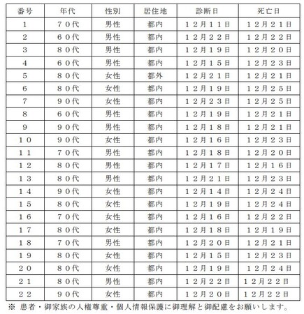 都内で新型コロナウイルスに感染した方が死亡されましたのでお知らせします。