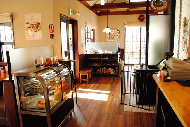 併設のカフェでは、生活雑貨や特産品の販売も。木のぬくもりを感じる店内で、くつろぎのひと時をお