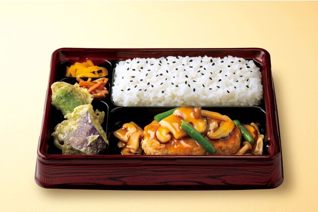ハンバーグとあんに、豆腐・鶏肉・山芋・きのこ・インゲン・卵を使用しているため、たんぱく質・ビタミン類・ミネラル類をバランスよく摂ることができる一品「豆富バーグ弁当 3種のきのこあん」が期間限定で登場。