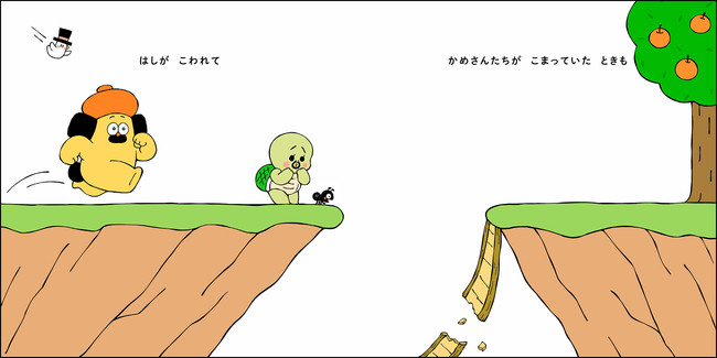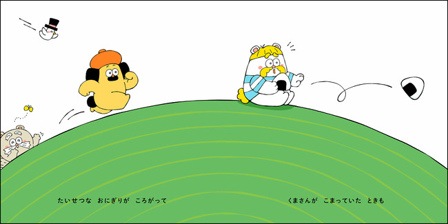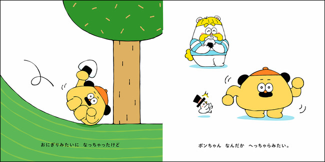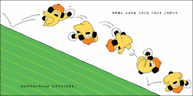 例えば、くまさんの大切なおにぎりが転がっていくのを見つけたら、追いかけずにはいられず、すぐさま猛ダッシュ。ヒーローのように華麗にキャッチしたかと思えば、ころころころころと坂道を転がり落ち、ポンちゃんの姿はおにぎりみたいな三角形になってしまうのでした。