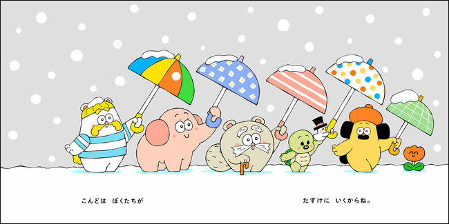 またあるときは、雪がしんしんと降る中、寒さに震えるお花を見つけたら、そっとカサを差し出します。どんなに厳しい環境でも、困っている人がいたら何時間でもがんばっちゃう。気づけば、ポンちゃんの頭や耳にはこんもりと雪が積もっているのでした。そんなポンちゃんのことが心配で、ポンちゃんにカサを差し出す友達の列が。感動のシーンに、読者がぐっときたのも束の間、ポンちゃんはやっぱり困っている友達を見つけてしまって、その子の元へさっと駆けつけました。それを見た友達は「やっぱりおひげのポンちゃんにはかなわないや」と思うのでした。