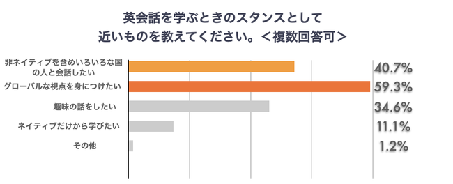 また上記質問で「かなりそう思う」「ややそう思う」「どちらともいえない」と答えた人に「英会話を学ぶときのスタンスとして近いものを教えてください。」と質問したところ、「グローバルな視点を身につけたい」(59.3%)、「非ネイティブを含めいろいろな国の人と会話したい」(40.7%)が続き、「ネイティブだけから学びたい」は11.1%に留まりました。