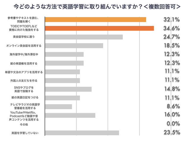 続いて学生に「今どのような方法で英語学習に取り組んでいますか?」と質問したところ、最も多い回答が「TOEICやTOEFLなど資格に向けた勉強をする」(34.6%)、次いで「参考書やテキストを読む、問題を解く」(32.1%)となりました。