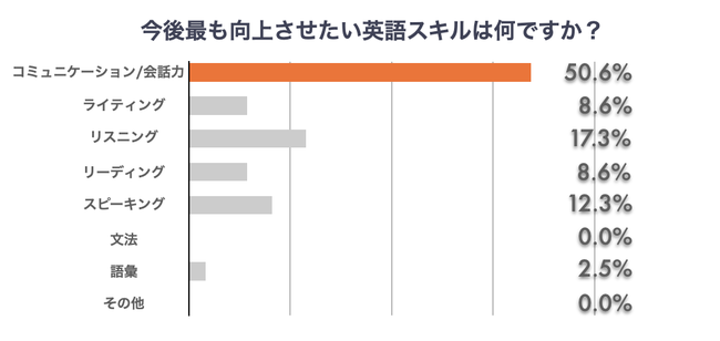 今後最も向上させたい英語スキルは「コミュニケーション/会話力」(50.6%)