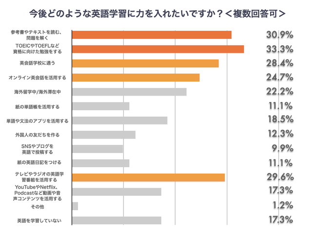 「今後どのような英語学習に力を入れたいですか?」という問いに対しても、最も多い回答は「TOEICやTOEFLなど資格に向けた勉強をする」(33.3%)、次いで「参考書やテキストを読む、問題を解く」(30.9%)となりました。また、ほぼ僅差で「テレビやラジオの英語学習番組を活用する」(29.6%)、「英会話学校に通う」(28.4%)、「オンライン英会話を活用する」(24.7%)が続く結果となりました。