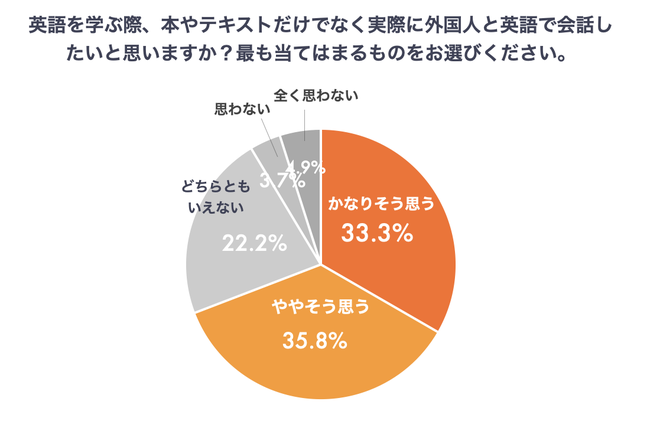「英語を学ぶ際、本やテキストだけでなく実際に外国人と英語で会話したいと思いますか?」という問いに対しては、「かなりそう思う」(33.3%)「ややそう思う」(35.8%)となり、「外国人と英語で会話をしたい」と考える人が3分の2以上を占める結果となりました。