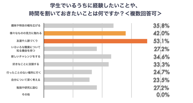 最後に「学生でいるうちに経験したいことや、時間を割いておきたいことは何ですか?」という質問をしたところ、下記のような結果となりました。