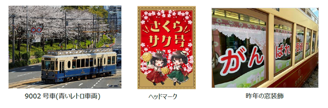 「さくらサク号」は、9002号車(青いレトロ車両)の車両前面に「さくらサク号」特別ヘッドマークを装着するほか、車内や窓に桜をイメージした装飾や受験生への応援メッセージを掲出し、合格へ向けて頑張る受験生を応援します。