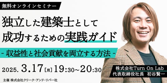 株式会社クリーク・アンド・リバー社(C&R社)は3月17日(月)、独立を考える建築士の方を対象に、無料のオンラインセミナー「独立した建築士が成功するための実践ガイド:収益性と社会貢献を両立する方法」を開催します。