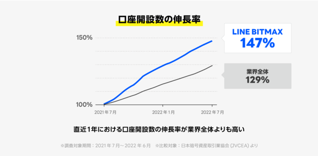国内の暗号資産における市況が落ち込むなか、直近1年間の口座開設数の伸長率が147%と、業界全体と比べ高い伸長率を記録しています。