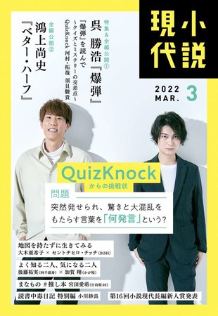 株式会社講談社(本社:東京都文京区)が発行する小説誌「小説現代」3月号(2月22日⦅火⦆発売号)の特集は、直木賞候補常連、いま文学賞シーンで最も注目される作家・呉勝浩の最新長編『爆弾』を単行本発売に先駆けて、全編公開! 作中で爆弾の在り処がクイズで示されることから、大人気メディア、QuizKnockと初コラボ。メンバーの河村・拓哉と須貝駿貴が表紙&グラビアに登場し、二人の読書体験を交えつつ、『爆弾』と謎解きの魅力について語ったロングインタビューも掲載します。