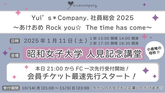 2025年1月11日開催、「 Yui’s*Company. 社員総会2025 ~あけおめ Rock you ☆ The time has come~」チケットFC最速先行が受付中!
