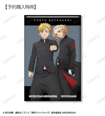 当商品をBOX、または単品にて1BOX相当数ご注文ごとに、予約購入特典として「描き下ろしイラスト 花垣 武道&佐野 万次郎 応援団服ver. スクエア缶バッジ AMNIBUS限定特典」を付属いたします。