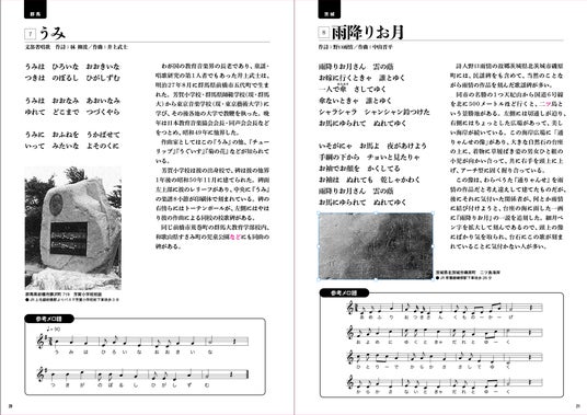 多くの人々に愛されている【童謡】【唱歌】【歌曲】を、全国のそれぞれの歌にゆかりのある地に立てられている『歌碑』を軸にまとめられた、童謡・唱歌・歌曲集。
