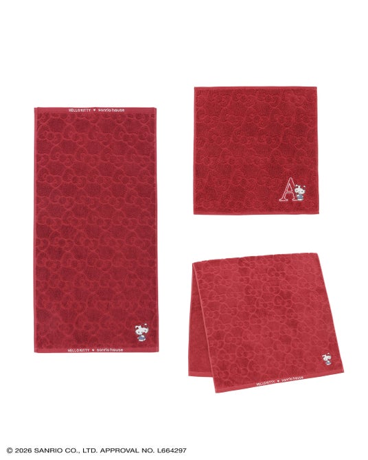 ハローキティリボンフェイスタオル/RED 2,640円、ハローキティリボンバスタオル/RED 5,720円、【ONLINE限定】イニシャルハローキティリボンハンドタオル(レッド)/RED 1,540円