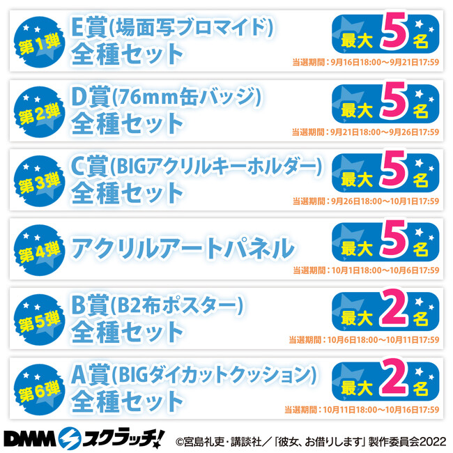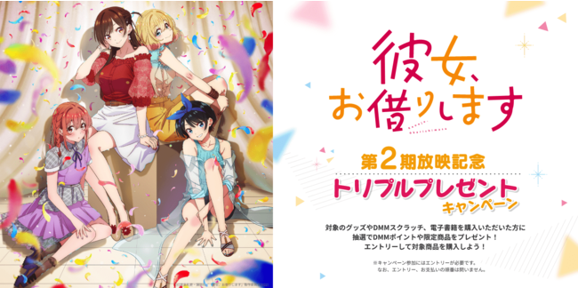 合同会社DMM.com(本社:東京都港区、会長 兼 CEO亀山敬司、https://dmm-corp.com/ 以下DMM )は、『TVアニメ「彼女、お借りします」第2期放映記念トリプルプレゼントキャンペーン』を9/16(金)から9/30(金)まで開催いたします。