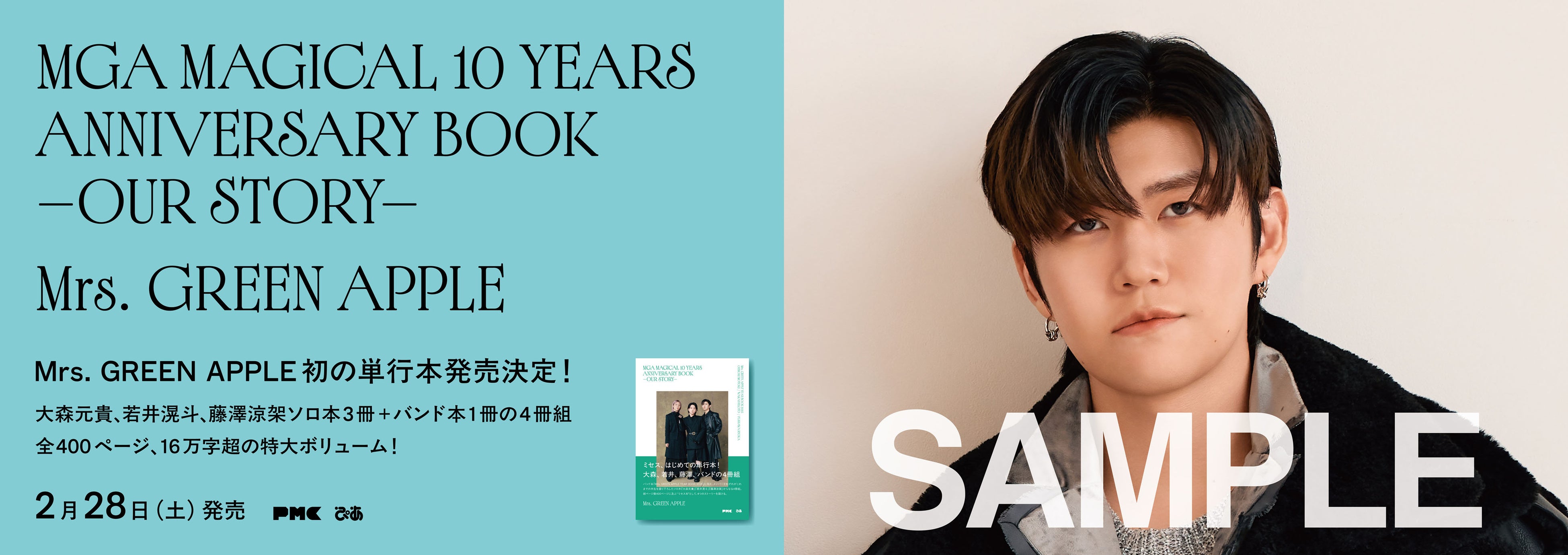 好評予約受付中のMrs. GREEN APPLE初の単行本『MGA MAGICAL 10 YEARS ANNIVERSARY BOOK -OUR STORY-』ですが、2月28日(土)の発売に向けて、本日2月23日(月祝)より3月1日(日)までの期間、東京・渋谷にて大型パネル&デジタルサイネージの掲出を実施いたします。