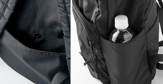 リュックを背負ったまま荷物を出し入れできる、背面ポケットも便利です。ペットボトルや水筒などを入れるのにちょうどよいサイドポケットも左右についています。