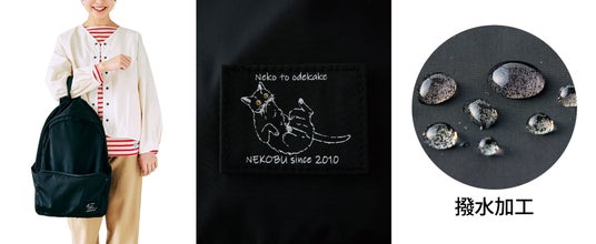リュック上部のループ部分は、腕が通せる程度の長めで手持ちしやすい設計。電車内や人混みで、手持ちスタイルにするときに便利です。前面ポケットに付けられた猫部のタグも、ワンポイントになっていてとってもキュートです。リュックの表面は、雨の日も安心な撥水加工が施されています。