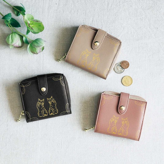 左手招きは金運、右手招きは人運を招くとされるポーズの猫さんたちがダブルで描かれた二つ折り財布です。