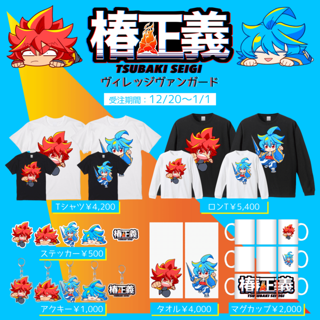 2022年12月20日(火)より、熱血ヒーロー師弟アニメチャンネル【椿正義】のヴィレッジヴァンガード限定グッズがオンラインストアにて発売決定!!受注期間は2022年12月20日(火)18:00~2022年1月1日(日)23:59となっておりますので、この機会をお見逃しなく!