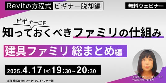 株式会社クリーク・アンド・リバー社(C&R社)は4月17日(木)、Revitの使用経験が浅いBIMオペレーターや設計者の方を対象に、無料のオンラインセミナー「【Revitの方程式・ビギナー脱却編】ビギナーこそ知っておくべきファミリの仕組み~建具ファミリ総まとめ編~」を開催します。