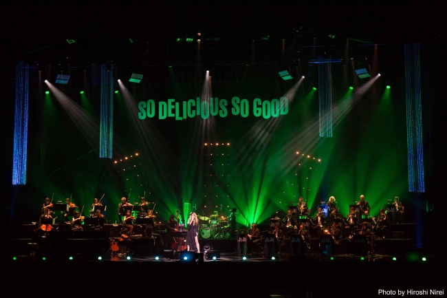 3曲目からは、その女性が恋に落ちたら…という流れ。スタンダードジャズの名曲「Night And Day」は、ピンク色の光に包まれるスイートな空間で甘えるように歌いかけた。続く「We Are In Love」は、つい体を揺らしたくなる心弾むサウンドに乗せスキャットを華麗に決めた。「Take Five」では、スリリングなドラムソロにフルートが共鳴するイントロに、フェイクで歌に入っていく流れが見事だった。ストリングス10名、ホーン隊やバンドが17名という圧倒的なサウンドにも負けない歌の存在感に改めて感服するほかはない。