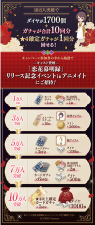 キャンペーンでは事前登録者数に応じて最大でダイヤ1700個やカードガチャ10回分アイテム、★4確定カードガチャ1回分アイテムなど豪華アイテムがもらえるキャンペーンとなります。さらに、アニメイトゲームスでの事前登録者限定で、アニメイトでのお買い物に使える300アニメイトポイントをプレゼントするほか、応募者の中から抽選で「リリース記念イベント」へご招待します。
